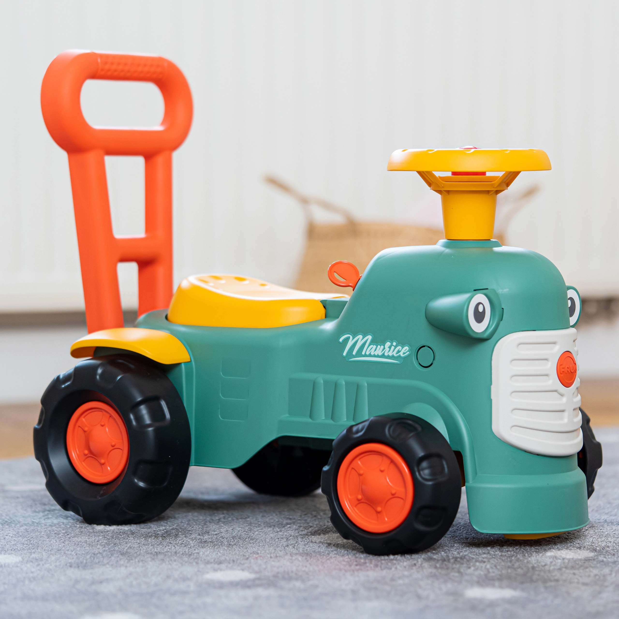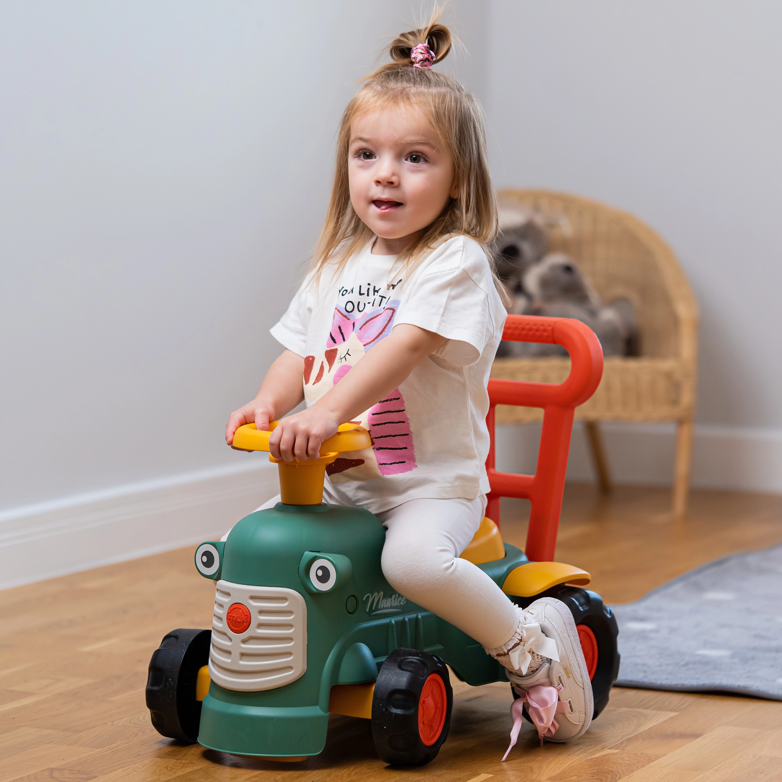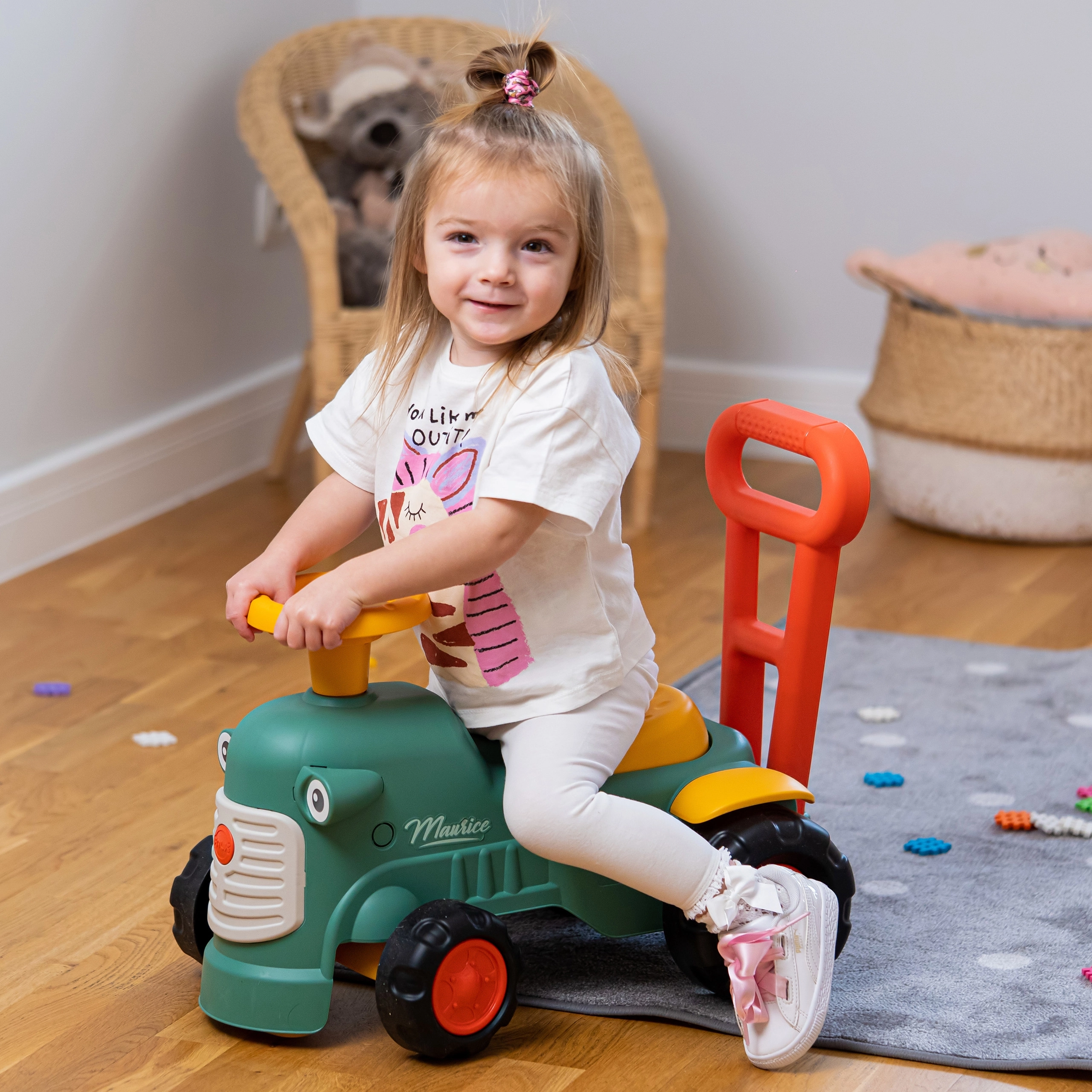 Roztomilé odrážedlo ve tvaru traktoru FALK Maurice je skvělým společníkem pro první krůčky dětí od 12 měsíců. Díky světlým barvám, zaobleným tvarům a stabilní čtyřkolové konstrukci si malé děti užijí bezpečnou zábavu doma i venku. Klakson na volantu, otočné přední kolo a madlo/opěradlo podporují rozvoj motoriky, rovnováhy a koordinace. Pod sedlem je praktický schovávek na drobnosti a bezpečnostní výstupky proti převrácení dodají klid při každé jízdě.