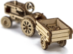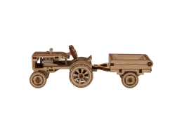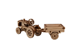Model traktoru s přívěsem má pohyblivá kola a bohaté ryté detaily. Přívěs lze naklopit – ideální jako působivá dřevěná dekorace.