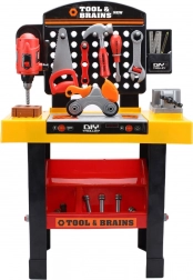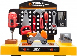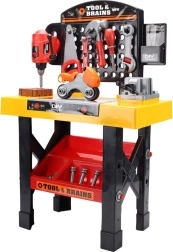Součástí je 39 kusů příslušenství – vrtačka, pilka, kladivo, šroubováky, klíče, matičky, šrouby a spojky. Z vybraných dílů mohou děti skládat například motorku nebo buldozer, což podporuje tvořivost a logické myšlení.