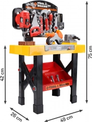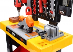 Tato realistická dětská dílna přináší vše, co malý kutil potřebuje. Robustní deska stolu s otvory pro šroubky, funkční svěrák a vertikální vrtačka dodají hře autentičnost. Spodní odkládací police, přihrádky a háčky udrží všechny nástroje přehledně na svém místě.