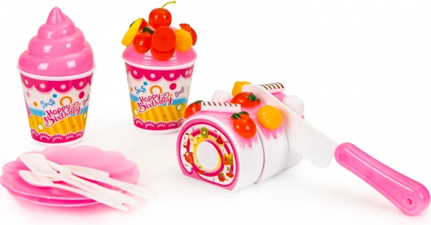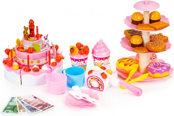 Kromě dortu sada zahrnuje rozmanité sladké doplňky, které činí hru ještě poutavější. Obsahuje sušenky, cupcakes, donuty a zmrzlinu v pohárech, ideální pro zábavné hry.