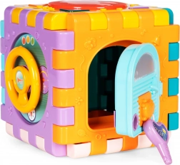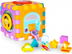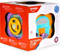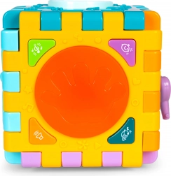 Jedna ze stěn kostky nabízí tlačítka s radostnými melodiemi a zvuky. Po stisknutí se rozsvítí střed kostky různými barvami do rytmu melodií.