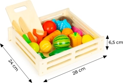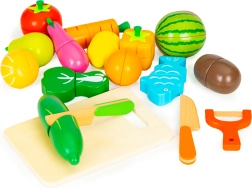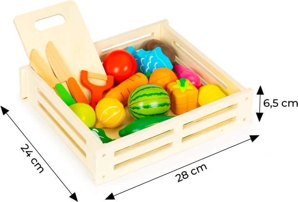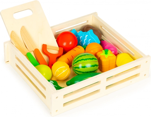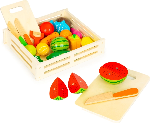 Zábavná sada pro dětskou kuchyňku: 17 dílů dřevěné zeleniny a ovoce s možností krájení a opětovného spojení díky magnetům. Součástí je prkénko, 2 nože a škrabka v praktickém úložném boxu. Ideální od 3 let pro rozvoj jemné motoriky, kreativity a poznávání potravin.