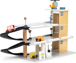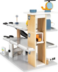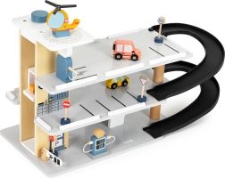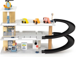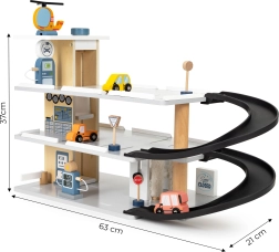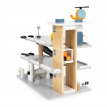 Tato víceúrovňová dřevěná garáž přináší dětem skutečnou akční zónu: autíčka sviští po nájezdech mezi patry, zastavují u dopravních značek a díky pohyblivému výtahu se snadno přesouvají nahoru i dolů. Na střeše je připraven heliport, kde může přistát přiložená helikoptéra.