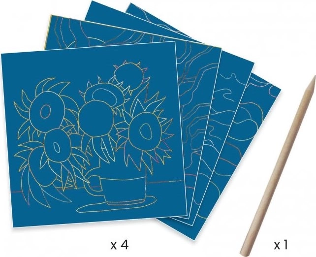 Tato výtvarná sada přibližuje dětem hravým způsobem tvorbu VINCENTA VAN GOGHA. Každý tah rydla odkryje novou barvu a texturu, díky čemuž vznikají působivé obrázky, které si mohou děti hrdě vystavit.