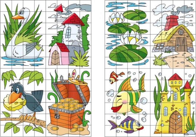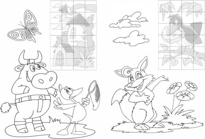 Každá stránka obsahuje veselé 24dílné puzzle ze samolepek. Děti hledají správná místa a skládají celý obrázek – ideální pro trénink soustředění a koordinace.