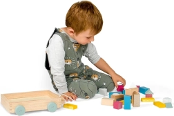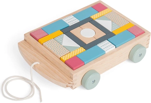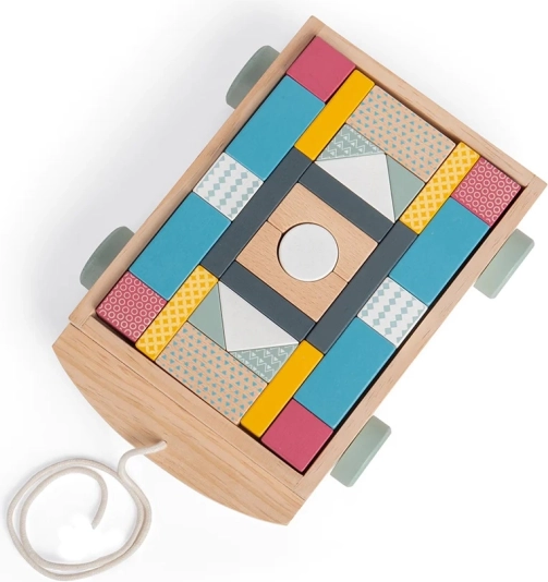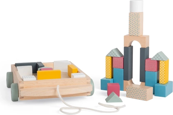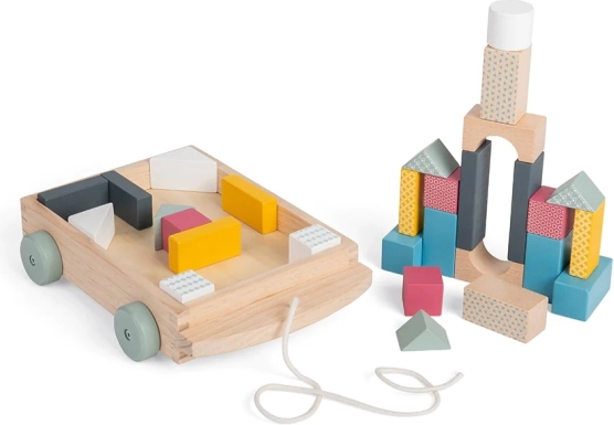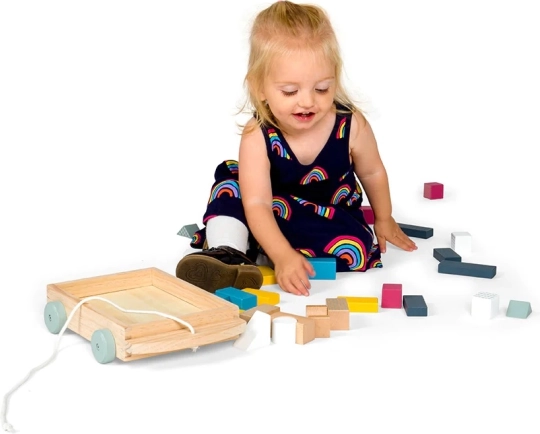 Dřevěný vozík s 29 barevnými kostkami v moderních pastelových odstínech je skvělou pomůckou pro první stavění, třídění a učení. Kostky mají příjemné rozměry, dobře se drží a uklízí zpět do vozíku, který lze snadno tahat za pevný provaz. Hračka napomáhá rozvoji rovnováhy, koordinace i fantazie.