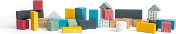 Různé tvary a pastelové barvy s atraktivními vzory podněcují fantazii, učení barev a tvarů i samostatnou hru ve stylu Montessori.