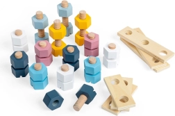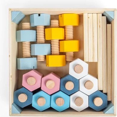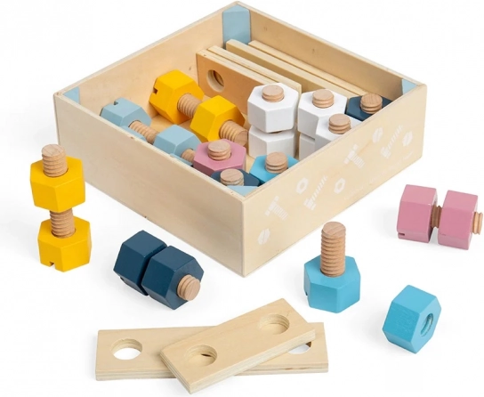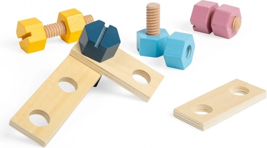 Tato nadčasová dřevěná sada matic, šroubů a lišt s otvory povzbudí děti k objevování prvních principů konstrukční hry. Jemné pastelové barvy, příjemná textura dřeva a bezpečné tvary podněcují smyslové vnímání i představivost.