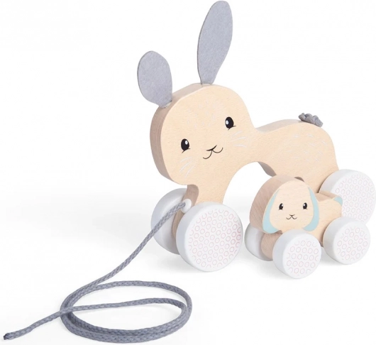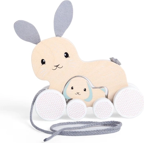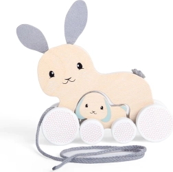 Tento půvabný tahací zajíček s ukrytým mládětem je ideálním parťákem na první výpravy po bytě. Díky kvalitnímu zpracování z udržitelně těženého FSC® dřeva a barvám bezpečným pro děti je hra nejen zábavná, ale i bezpečná. Měkké plstěné uši a ocásek dodávají hračce milý vzhled a příjemnou hmatovou stimulaci.
