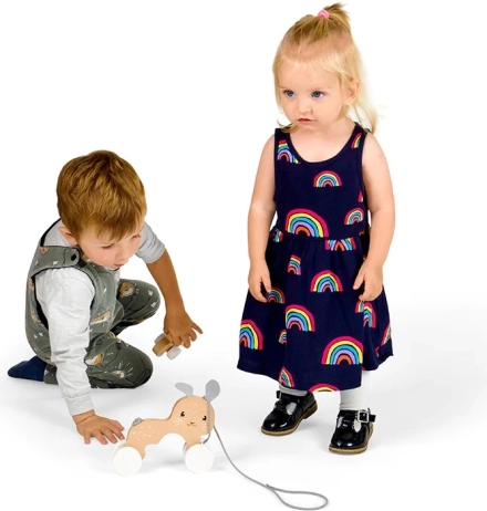 Čtyři pevná kolečka s geometrickým vzorem jezdí plynule po rovných površích, zatímco šedý tahací provázek se dobře drží i v drobných ručkách. Hračka napomáhá rozvíjet obratnost, rovnováhu a koordinační dovednosti, podporuje aktivní pohyb i fantazii.