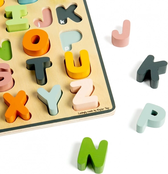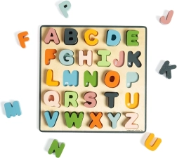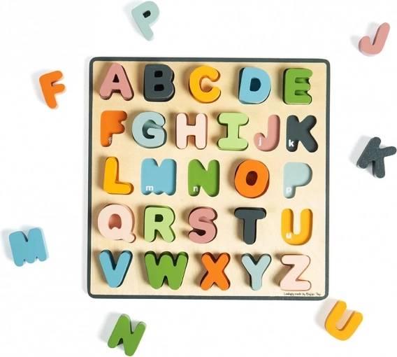 Dřevěné puzzle s 26 pestrobarevnými písmeny je perfektní pomůckou pro první seznamování s abecedou. Každé písmeno má svůj výřez v odpovídající barvě, což dětem usnadňuje zapamatování a správné přiřazování. Díky pevným a snadno uchopitelným dílkům si děti procvičí koordinaci oko–ruka a soustředění.