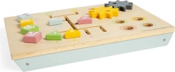 Stůl zahrnuje řadu činností podporujících raný rozvoj: děti mohou zatloukat kolíky dřevěným kladívkem, zkoušet utahovat závitové šrouby s hlavami zvířátek, otáčet dřevěná ozubená kola nebo vkládat číslované trojúhelníky do správných otvorů. Hračka je vyrobena z eticky získaného FSC® dřeva a splňuje současné evropské bezpečnostní normy.