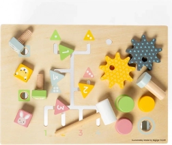 Součástí je dřevěné kladívko, 4 hřebíčkové kolíky a 4 závitové šrouby se zvířecími hlavičkami, které podporují sílu prstů, úchop a koordinaci ruka-oko.