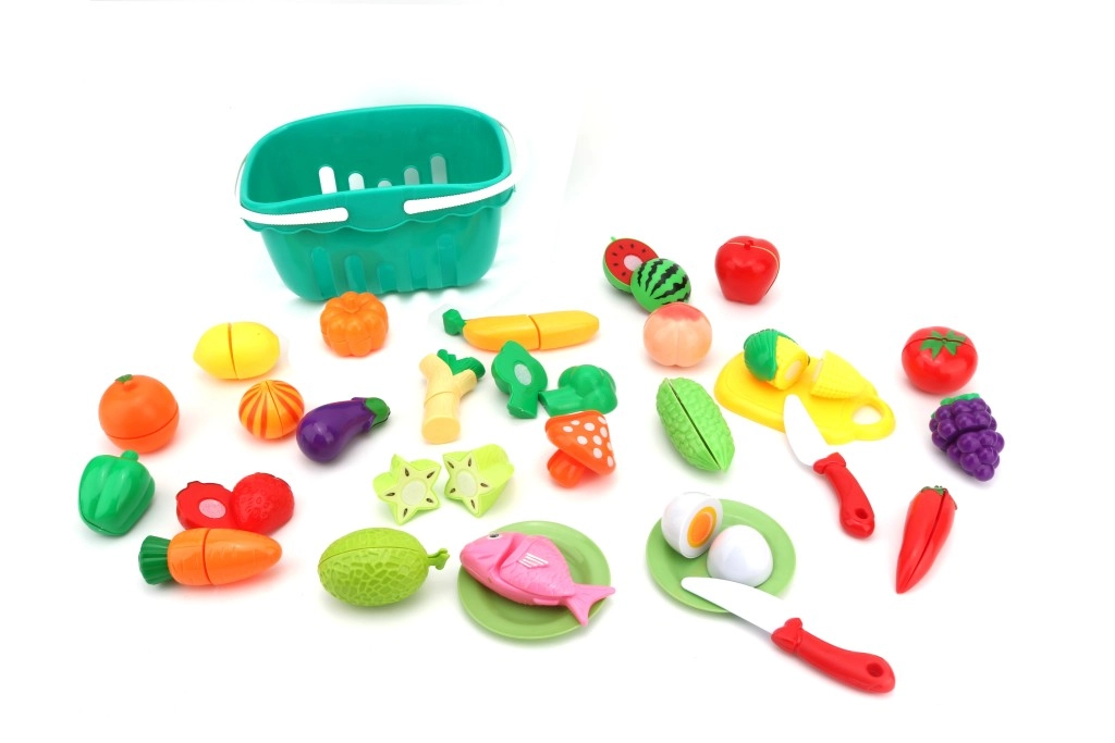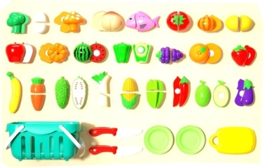 - 30dílná sada ovoce, zeleniny, rybky, talířků, prkénka a nožíků