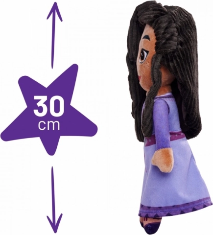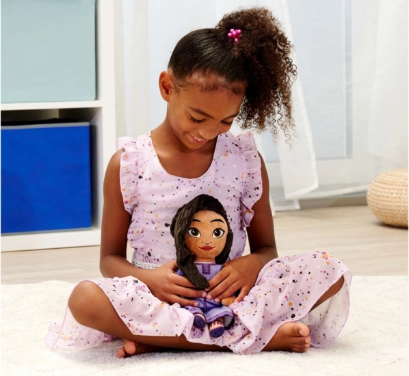 Přivítejte do dětského pokojíčku kouzlo filmu Disney Wish. Plyšová panenka Asha v nádherných fialových šatech je měkká, bezpečná a skvěle padne do dětských rukou. Děti si ji zamilují jako věrnou kamarádku na cesty, do postýlky i na každodenní hraní.