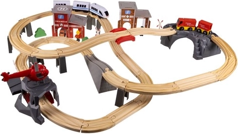 Postavte si vlastní železniční město a nechte vlak uhánět po 4,8 m dlouhé trati přes mosty, křižovatky a kolem budov. Děti si užijí realistickou hru s osobním vlakem na baterie, vrtulníkem a hasičskou stanicí, zatímco budou rozvíjet kreativitu, koordinaci oko–ruka a představivost.