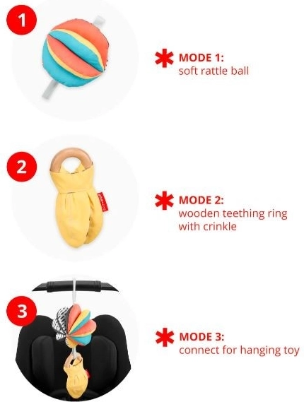 Naše hračka pro děti 3 v 1 DISCOVEROSITY poskytuje tři různé způsoby hraní díky možnosti jednotlivé předměty používat samostatně nebo je spojit dohromady. Měkká chrastítko má na jedné straně kontrastní vzor a na druhé výrazné barvy, zatímco dřevěný kroužek je vyroben z udržitelných materiálů. Tento komplexní design je ideální jak pro úchop, tak pro kousání.