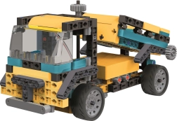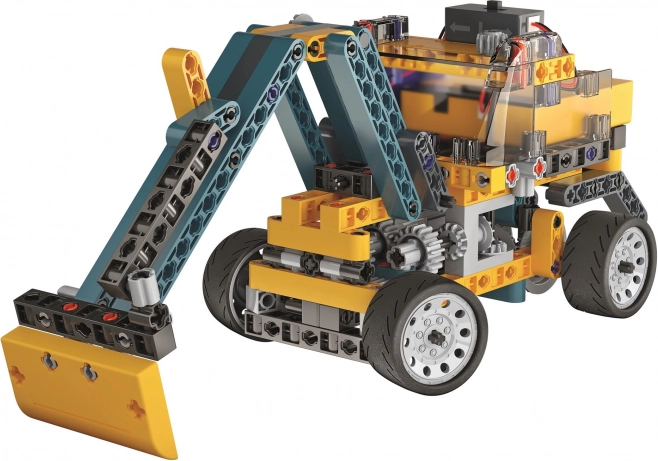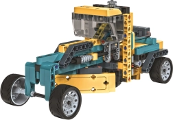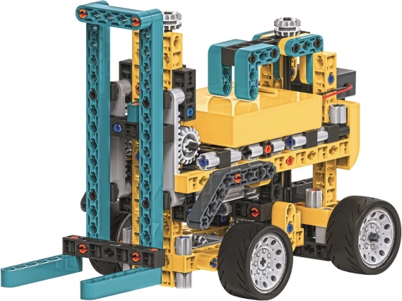 V balení najdeš více než 250 precizně zpracovaných dílů včetně ozubených kol (rovných i kuželových), diferenciálu, převodového modulu, bateriové schránky a dalších prvků. Z jedné sady postavíš až 20 různých stavebních vozidel – od míchačky přes nakladač až po bagr – a pochopíš přitom principy převodů, přenosu síly a kinematiky.