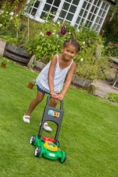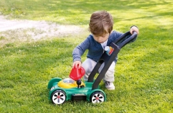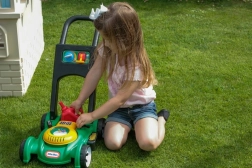 Při tlačení sekačky si děti zlepšují rovnováhu, koordinaci i hrubou motoriku a učí se samostatnosti.