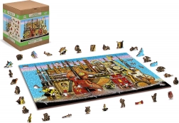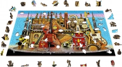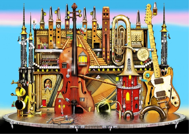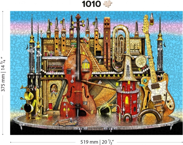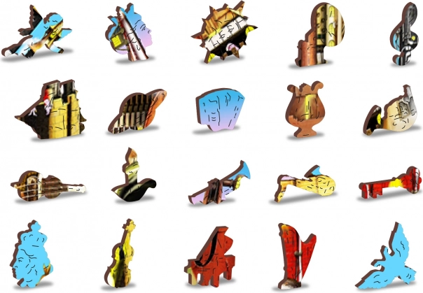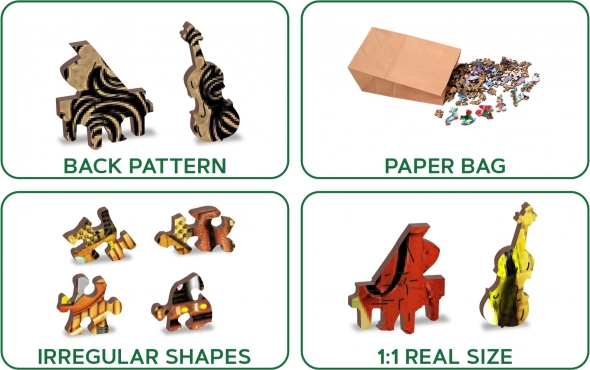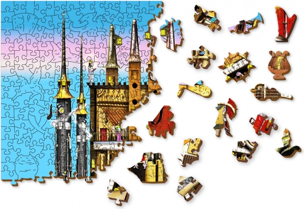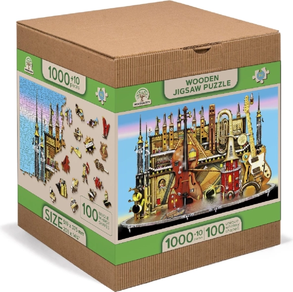 Toto prémiové dřevěné puzzle přináší originální motiv hudebního města s nástroji a věžemi, který si zamilují dospělí i zvídavé děti. Dílky jsou vyřezány laserem z pevné HDF desky (3–4 mm), mají hladké hrany bez třísek a část z nich tvoří speciální tvary zvířat, staveb a předmětů. Díky nim je skládání náročnější, ale zároveň nesmírně zábavné a vizuálně působivé.