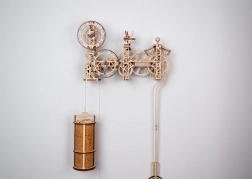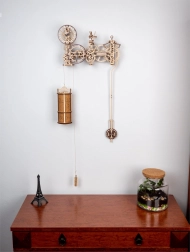 Otevřená konstrukce s ozubenými kolečky a pákami zaujme na první pohled. Estetická dekorace, která zároveň učí mechanice.