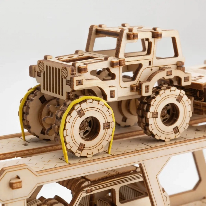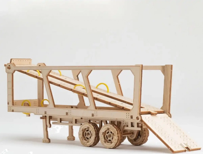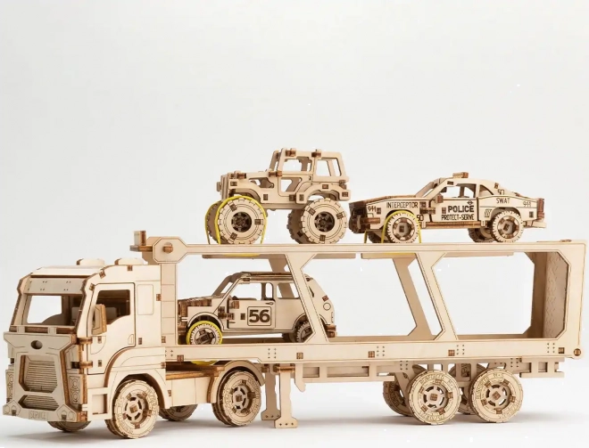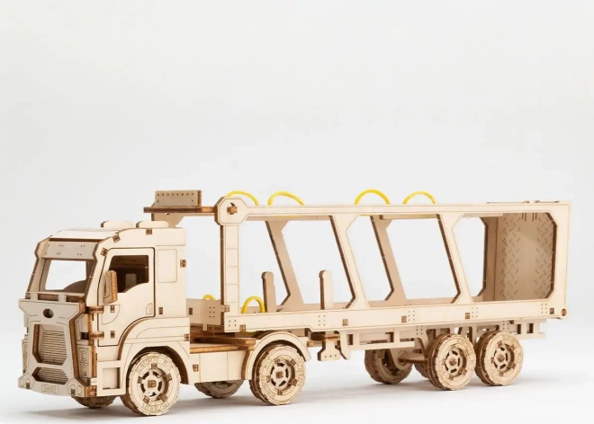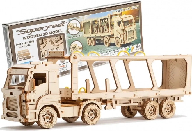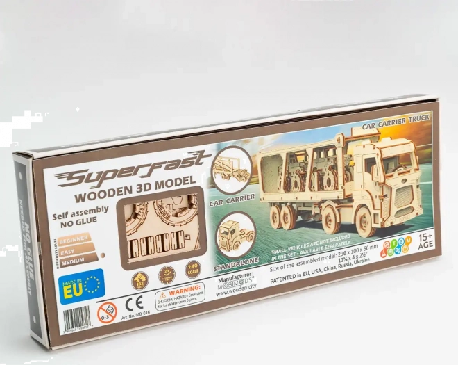 Dřevěné 3D puzzle WOODEN CITY – Car Carrier Truck ze série Superfast přináší jedinečný zážitek ze stavby i hry. Díky promyšlené mechanice a voskovému mazání se model po sestavení plynule pohybuje a věrně napodobuje reálný přepravník automobilů. Skládání probíhá bez lepidla a nářadí, jednotlivé díly přesně zapadají a výsledkem je robustní model z přírodního dřeva.