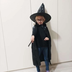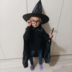 Tento stylový kostým kouzelníka nabízí všechno, co děti potřebují k vytvoření působivého a bezpečného převleku. Lehký plášť z příjemného materiálu elegantně splývá a díky vázání dobře drží na místě. Špičatý klobouk se po vyjmutí sám rozloží a vykouzlí efekt „wow”. Kulaté brýle bez skel jsou pohodlné a bezpečné při hře, hůlka z odolného plastu skvěle doplní každý trik.