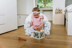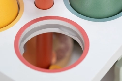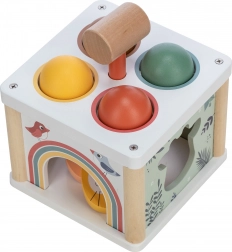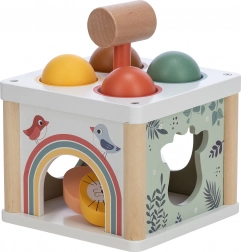Tento barevný dřevěný vkládací box nabízí dětem zábavný způsob, jak trénovat své motorické schopnosti. Sestává z boxu s kulatými otvory pro míčky, které lze pomocí kladívka prostrkávat skrze otvory. Ozdobený motivy zvířátek a přírody, tento box je nejen hračkou, ale také učební pomůckou pro rozpoznávání tvarů a barev.