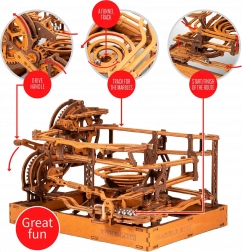 Kľíčové vlastnosti zahrnují ostré zákruty, spirálovité sestupy a pákové výtahy. Bez použití lepidla nebo nářadí si užijete skládačku hodnou inženýra. Stavěním se učíte o převodech, gumičkových motorech a ozubených kolech.