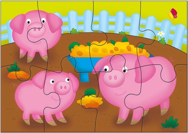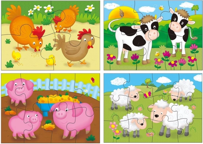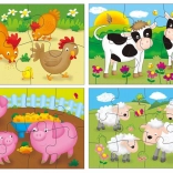 Tato sada obsahuje 4 rozdílné puzzle s motivy domácích zvířat – slepiček, kraviček, prasátek a oveček. Díky progresivnímu počtu dílků děti přirozeně postupují od jednoduššího ke složitějšímu obrázku, což posiluje jejich sebevědomí a radost ze skládání.