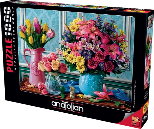 Objevte kvalitní puzzle s motivem květin ve váze od značky Anatolian o 1000 dílcích. Součástí balení je praktický stojánek na víko krabice jako předloha a výrobce nabízí službu zaslání chybějícího dílku. Rozměr složeného obrázku je přibližně 66 × 48 cm.