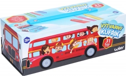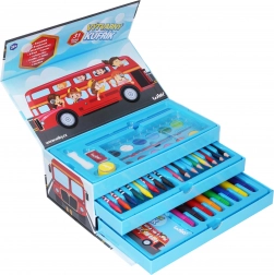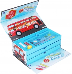 Vše, co mladí umělci potřebují, v jednom praktickém kufříku s motivem autobusu: 31 ks výtvarných potřeb – pastelky, voskovky, fixy, akvarelové barvy, guma, ořezávátko, tužka, štětec, houbička a deníček. Ideální na cesty i domů a jako skvělý dárek pro kreativní děti.