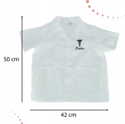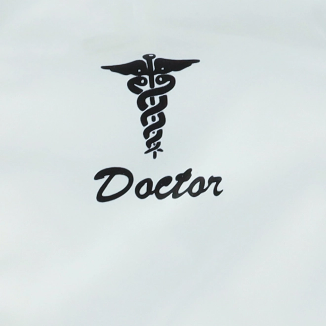 Bílý lékařský plášť s krátkými rukávy, dvěma kapsami a caduceus symbolem s nápisem 'Doctor'.