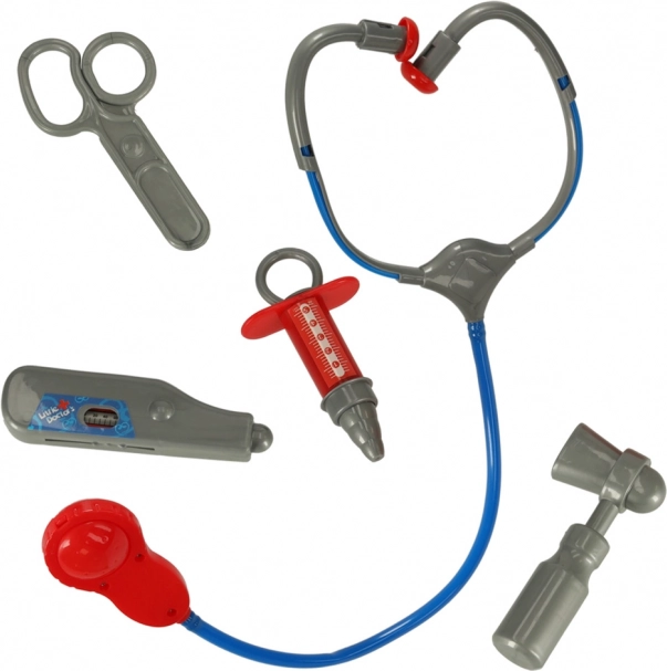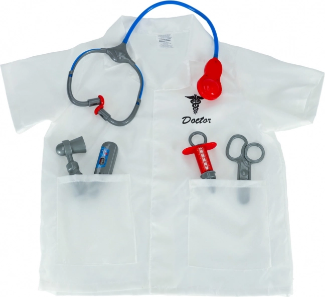 Obsahuje lékařský plášť a zdravotnické nástroje: stetoskop, nůžky, injekční stříkačku, teploměr a reflexní kladívko.