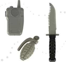 Kostým zahrnuje maskovací vestu, přilbu, plastový nůž, granát a krátkovlnnou vysílačku.