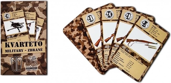 Kvarteto Military zbraně je perfektní hra pro všechny fanoušky vojenské historie a hry. Tato edice nabízí originální grafiku a spolupráci s uznávaným nakladatelstvím Naše vojsko. Karty obsahují fotografie historických i moderních zbraní.