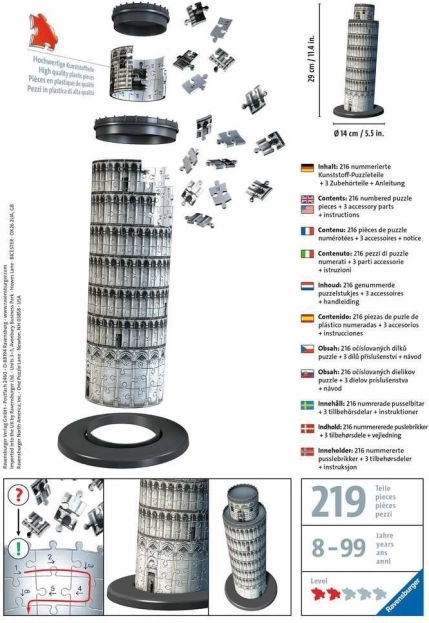 Ravensburger opět přináší inovaci ve světě puzzle s 3D modelem slavné Šikmé věže v Pise. Tento model obsahuje speciální dílky, které přesně zapadnou na své místo a nevyžadují lepidlo, díky čemuž je celé dílo odolné a stabilní.