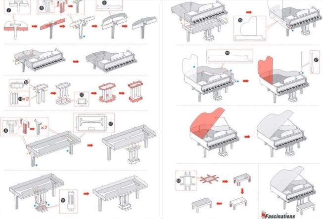 Hotový klavír o velikosti přibližně 7,5 × 6,8 × 5,9 cm se stane nepřehlédnutelnou dekorací doma, v kanceláři i ve školní vitríně. Balení obsahuje 2 ocelové plátky a ilustrovaný návod; k montáži doporučujeme malé štípací nůžky a jemné ploché kleště (nejsou součástí).
