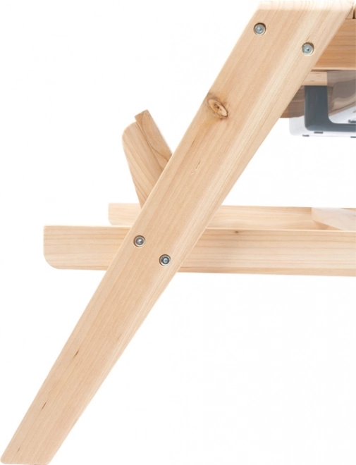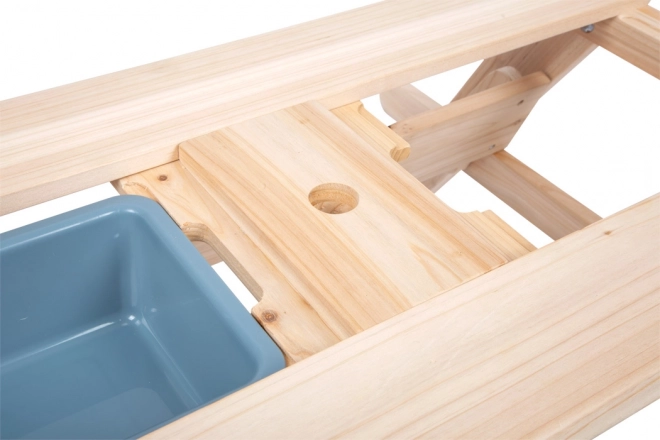 Dřevěný stůl slouží jako piknikový stůl i hrací plocha s vaničkami na písek nebo vodu.