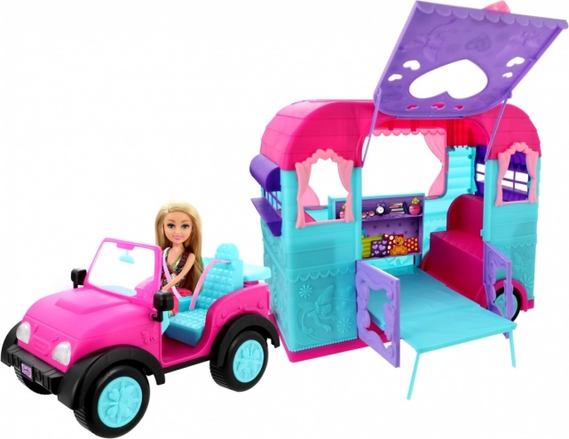 Tento barevný herní set přináší vše pro malé cestovatele: elegantní otevřený jeep, připojený k přívěsu s dekoracemi a panenku velikosti přibližně 26,5 cm. Děti si užijí hodiny fantazijní hry – od vyjížděk do přírody až po táboření pod hvězdami.