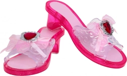 Pár růžových podpatkových střevíčků s velkými červenými srdcovými šperky a jemnými růžovými stuhami. Navrženy pro převlékání a hru, dokonale imitují princeznovskou obuv.