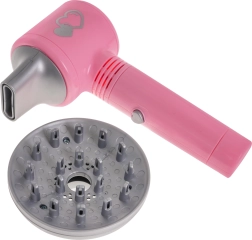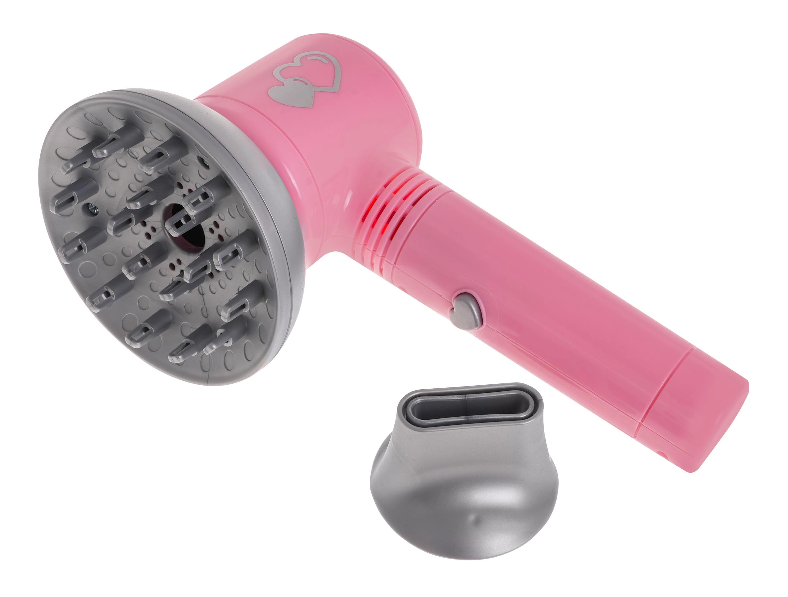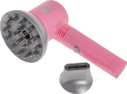 Dětská sada kadeřnických nástrojů zahrnuje vše, co potřebuje malá kadeřnice pro své první pokusy o úpravu vlasů. Fén je napájen bateriemi a nabízí jemný proud vzduchu, který věrně simuluje skutečné foukání vlasů. Disponuje i dvěma vyměnitelnými nástavci - difuzorem a koncentrátorem.