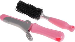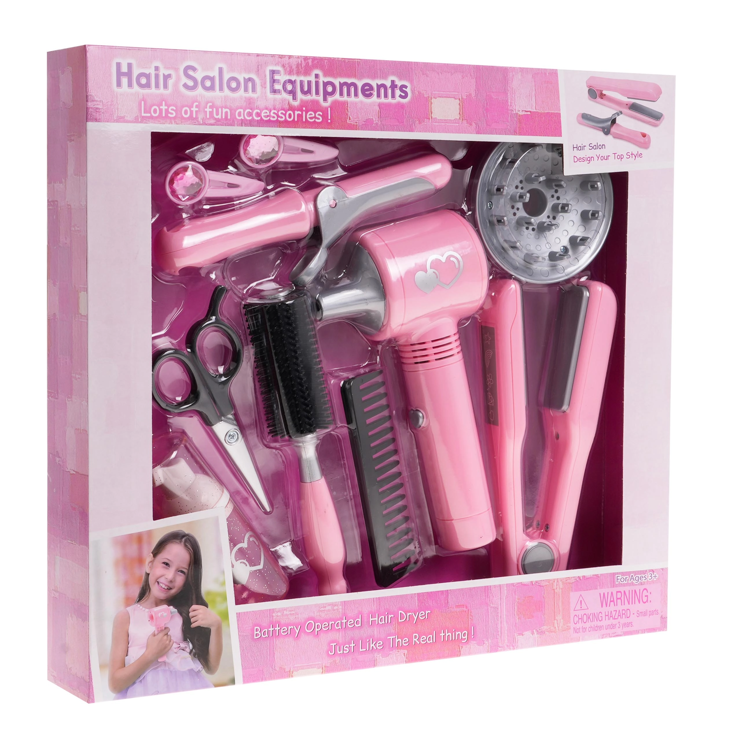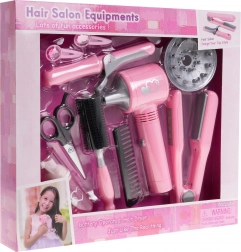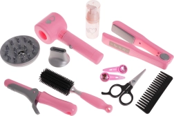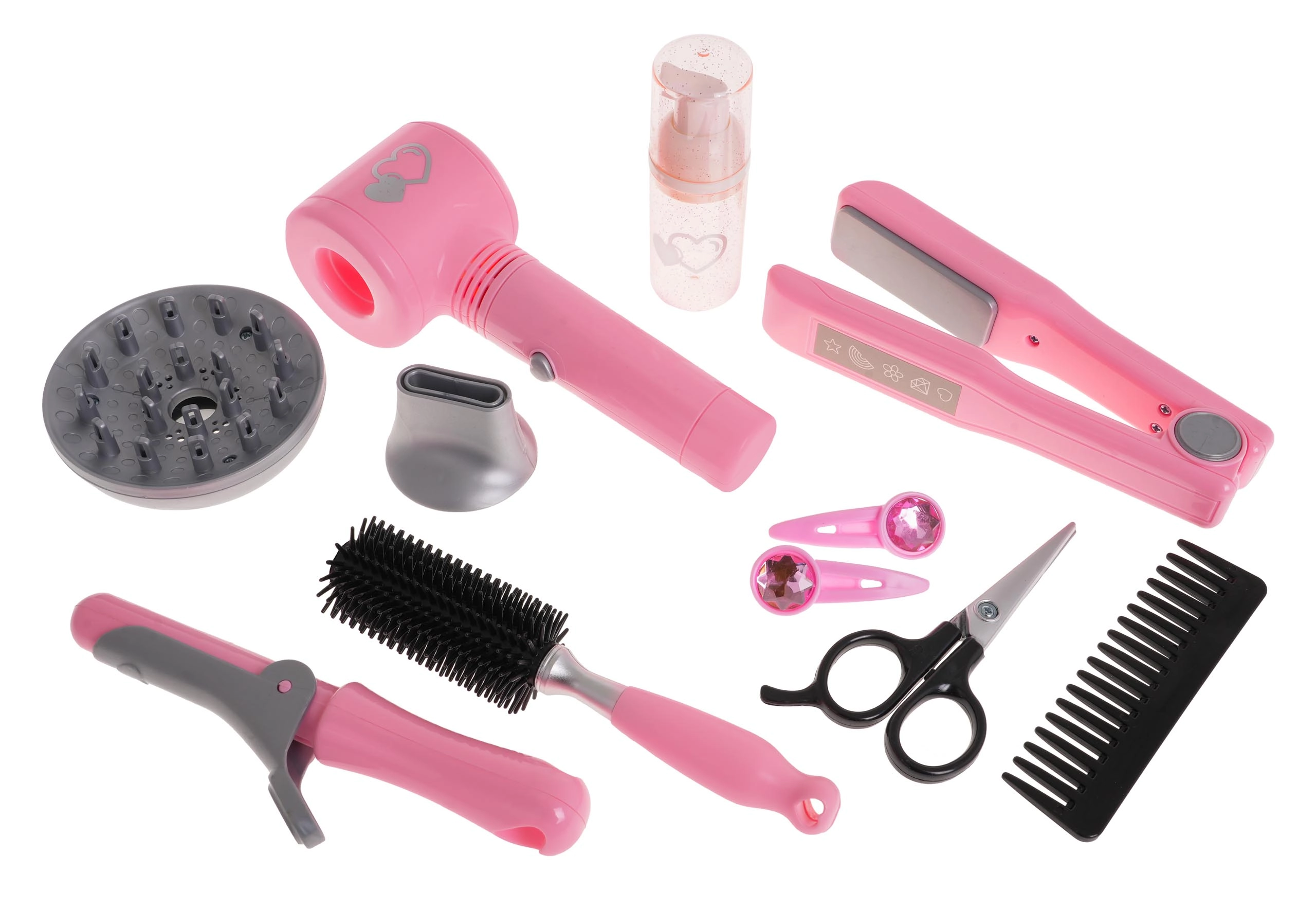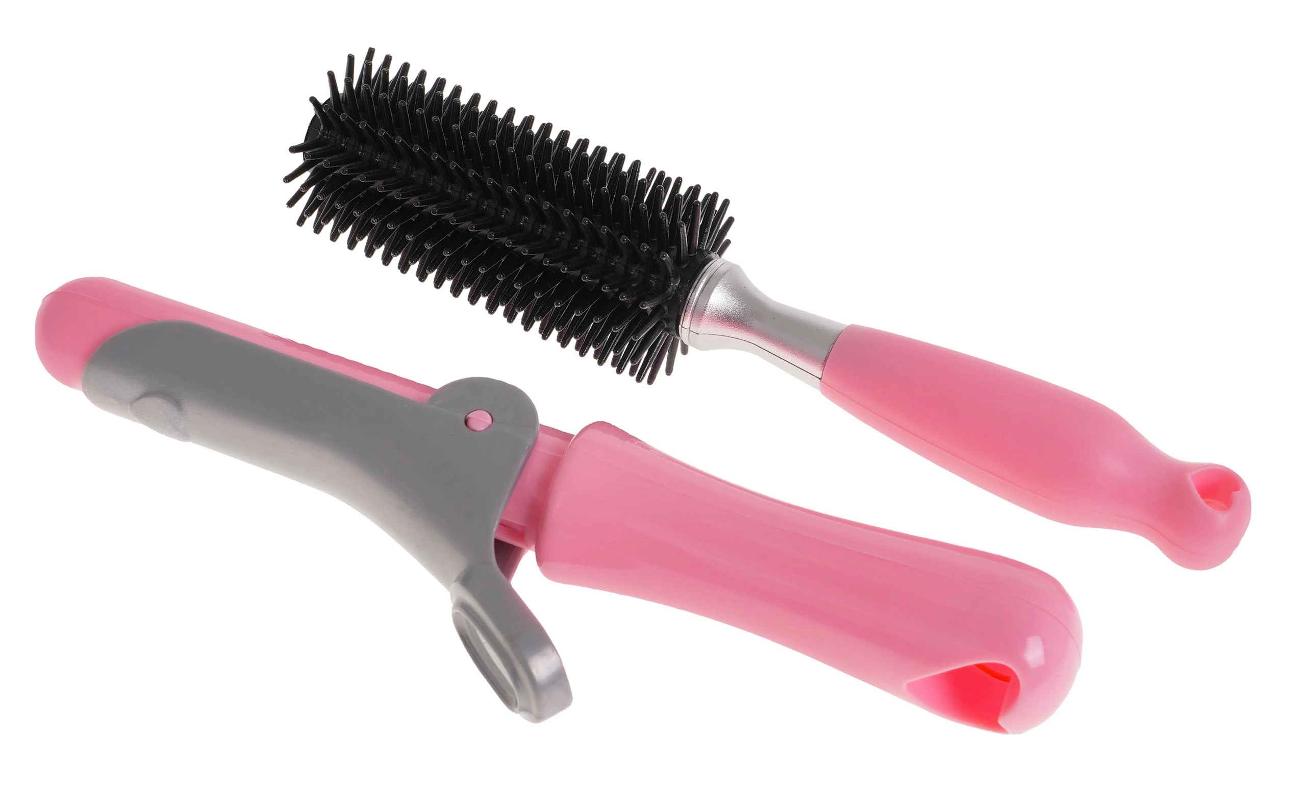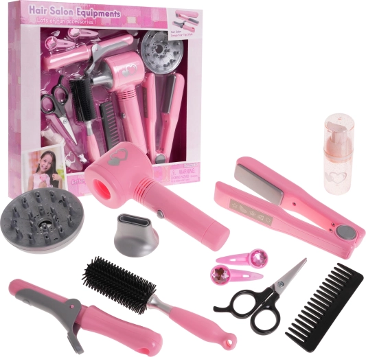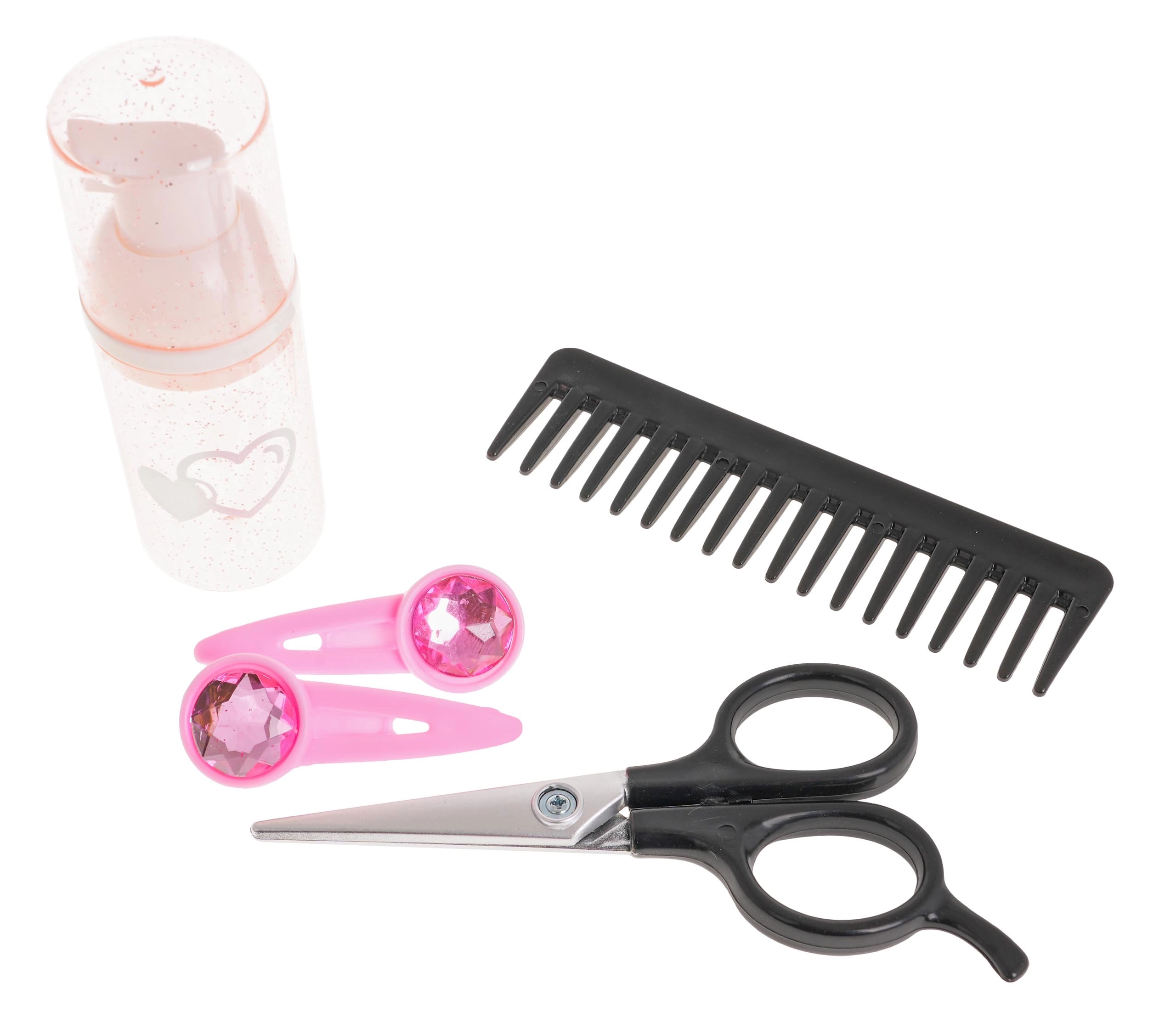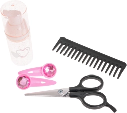 Sada obsahuje také kulmu a žehličku na vlasy, hřebínek, kartáč, nůžky, lahvičku a sponky na vlasy, což poskytuje vše potřebné pro kreativní hraní.