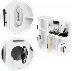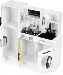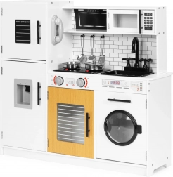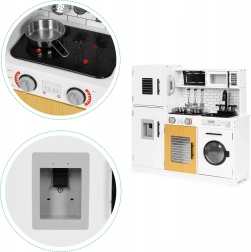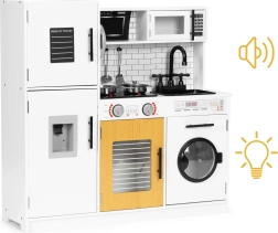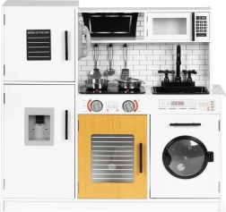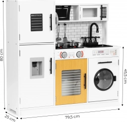 Tato stylová dětská kuchyňka v bílo‑dřevěném designu věrně napodobuje skutečnou kuchyň. Díky svítícím plotýnkam a zvukům vaření po stisku červených tlačítek je hra ještě poutavější. Otevírací dvířka na lednici, troubě, mikrovlnce i pračce, otáčecí knoflíky sporáku a „dispenzor vody“ s bublajícím zvukem podpoří realistické scénáře hry.