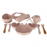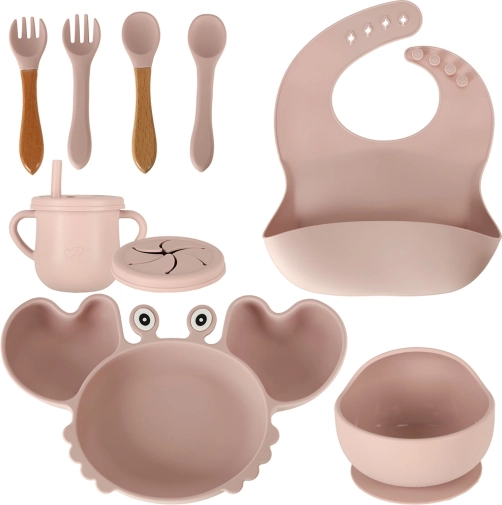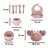 Kompletní 9dílná silikonová jídelní sada pro nejmenší s hravým talířkem ve tvaru kraba. Obsahuje vše pro pohodlné krmení i samostatné jedení: talíř a misku s přísavkou, tréninkový hrneček se dvěma víčky a slámkou, 2 lžičky, 2 vidličky a praktický bryndák s kapsou. Vyrobeno z bezpečného silikonu bez BPA, snadno se čistí a pomáhá omezit nepořádek díky přísavkám a zachytávací kapse.