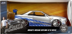 Kovový model auta z filmu Rychle a zběsile - GTR-R R34 na volnoběh v měřítku 1:24, otevírací dveře, kufr a kapota, délka 19 cm.