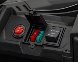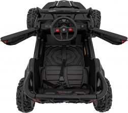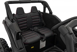 Sedadlo z ekokůže s bezpečnostními pásy, otevírací dveře a multimediální panel s MP3/USB/Bluetooth. LED světla vpředu i vzadu a zvuky motoru pro maximálně realistickou jízdu.