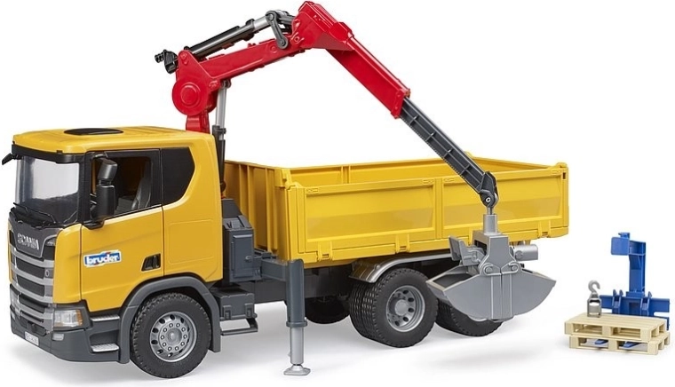 Pro snadné převážení materiálu slouží vyklápěcí ložná plocha a skládací bočnice. Balení obsahuje praktické příslušenství: dvě palety, paletové vidle a drapák s lopatou, takže děti mohou ihned začít se stavebními úkoly.