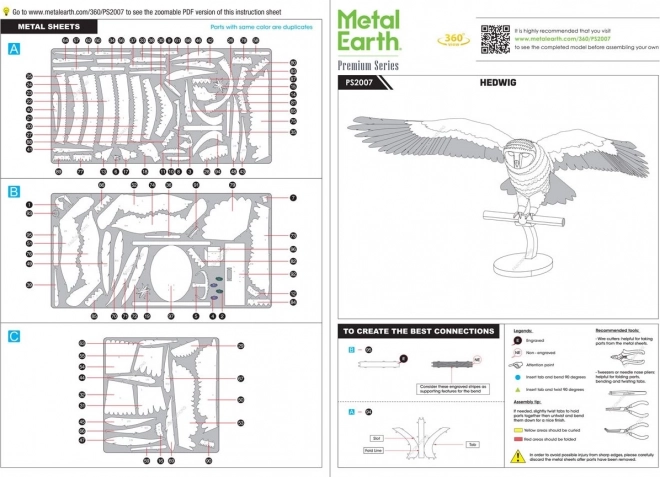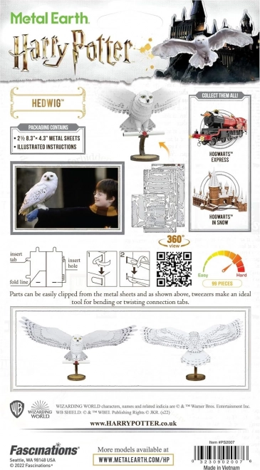 Užijte si precizní skládání kovového modelu Hedviky, věrné poštovní sovy Harryho Pottera. Z tenkých ocelových plátků s detailním laserovým gravírováním postupně vznikne realistická miniaturní replika s roztaženými křídly a dopisem v pařátech. Stavba je bez lepidla – jednotlivé díly se spojují pomocí zámků a ohýbaných jazýčků.